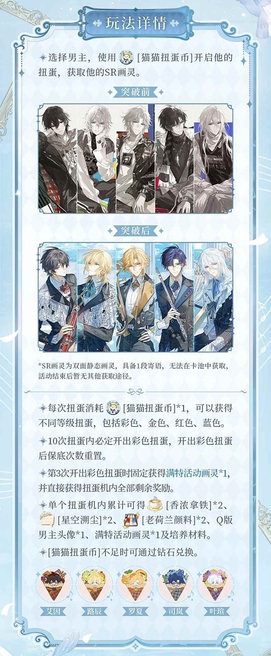 在时空中的绘旅人活动中,每进行10次扭蛋必定触发一次彩色扭蛋,而第三次彩色扭蛋的奖励将固定为对应男主的满特SR画灵。同时,达成该条件后还可直接领取扭蛋机内剩余的所有奖励,大幅提升获取效率。这一保底机制让玩家在投入资源时更具规划性,确保在一定次数内稳定获得关键画灵。