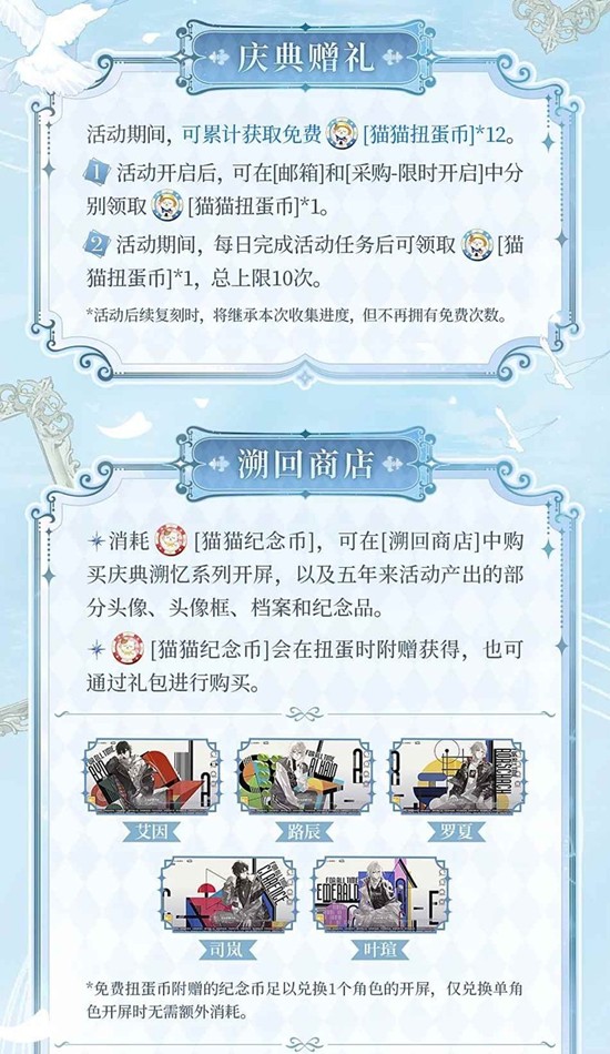 每次参与扭蛋还会附赠1枚[猫猫纪念币],可用于在[溯回商店]中兑换庆典溯忆系列开屏动画,以及过往五年内部分活动产出的头像、头像框、档案和纪念品。值得注意的是,活动结束后[猫猫扭蛋币]和[猫猫纪念币]均不会被回收,未来若活动复刻,将延续当前收集进度,但不再提供免费领取次数。时空中的绘旅人此次庆典溯忆画灵为双面静态稀有画灵,附带1段专属寄语,无法通过常规卡池获取。以上就是时空中的绘旅人庆典溯忆画灵获取攻略,希望切游网带来的信息能帮助你顺利参与活动。
