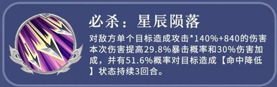 夏侯渊的必杀技名为星辰陨落,能够对敌方单体目标造成140%攻击力加上840点固定伤害。该技能不仅基础数值可观,还能提升自身29%的暴击率,并附加30%的伤害加成。更重要的是,释放星辰陨落后有50%概率使目标命中率下降,持续三个回合,这一效果在对抗高闪避或依赖精准命中的敌人时尤为关键,能有效打乱对方输出节奏。