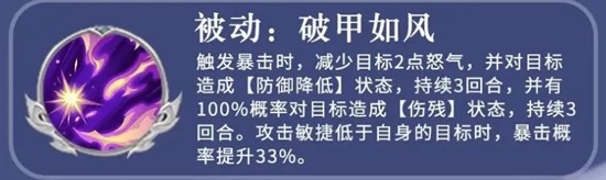 夏侯渊的被动技能破甲如风可在每次攻击时减少目标2点怒气值,并降低其防御力。若目标的敏捷属性低于夏侯渊,则触发概率提升33%。此技能必定附加伤残状态,使敌人在后续三回合内受到更多伤害。这一机制让夏侯渊在面对敏捷较低的敌方主力输出时更具压制力,同时干扰对方技能释放节奏。