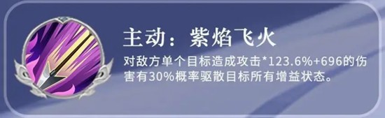 夏侯渊的主动技能紫焰飞火可对单一敌人造成123%攻击力的伤害,并附加696点额外伤害。该技能拥有30%概率触发驱散效果,可清除目标身上的所有增益状态。在面对依赖增益强化的阵容时,这一技能能有效打断敌方节奏,尤其克制依靠 buff 叠加输出的武将,如某些辅助核心或爆发型法师类角色。