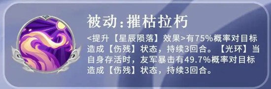 另一项被动技能摧枯拉朽进一步强化了星辰陨落的效果,并使该技能有75%概率附加伤残状态,持续三回合。此外,夏侯渊存活期间可为全体友军提供暴击率加成,光环效果显著提升团队输出能力。当夏侯渊成功触发多次伤残时,配合队友的高频率攻击,可迅速瓦解敌方前排或关键目标。