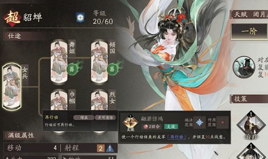 貂蝉在三国望神州中定位为全能辅助,拥有极为稀缺的再行动机制。她的技能翩若惊鸿能让一个已完成行动的友方单位重新获得行动机会,并恢复10点战意,极大延长主力输出的技能循环节奏。此外,貂蝉还具备治疗与复活能力,能够在关键时刻挽救濒死队友,是当前版本中最顶尖的支援型武将之一,适用于多种高强度副本与PVP场景。