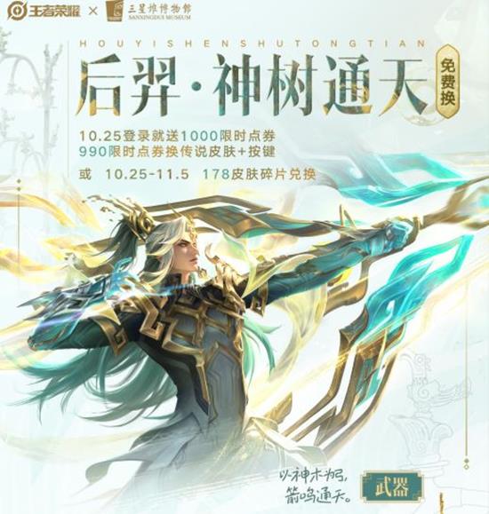 王者荣耀×三星堆博物馆,十周年携手艺术指导张艺谋,共创设计十周年限定皮肤【三星堆主题系列皮肤-寻迹三星堆】之后羿-神树通天,讲述青铜现王者,一眼见古今的宏大想象!
