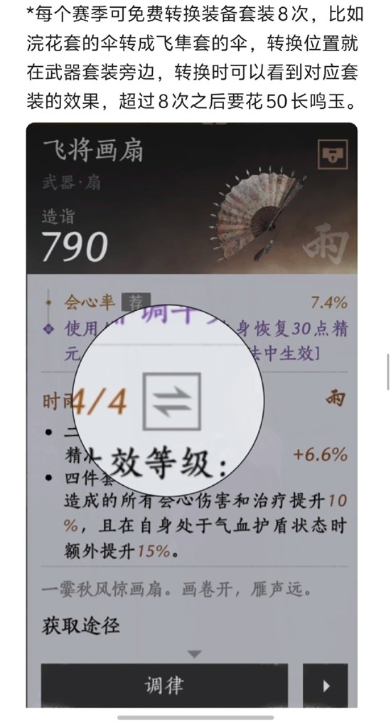 *每个赛季可免费转换装备套装8次,比如浣花套的伞转成飞隼套的伞,如果有已经调完的装备觉得还不错但是套装不对就可以用啦。转换位置在武器套装旁边,转换时可以看到对应套装的效果,超过8次之后要花50长鸣玉。