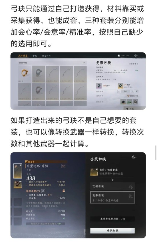 弓玦只能通过自己打造获得,材料靠买或采集获得,也能成套,三种套装分别能增加会心率/会意率/精准率,按照自己缺少的选用即可。