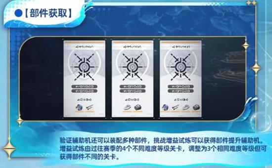 验证辅助机可以装配多种部件,挑战增益试炼可以获得部件提升辅助机。增益试炼由过往赛季的4个不同难度等级关卡调整为3个相同难度等级但可获得部件不同的关卡。