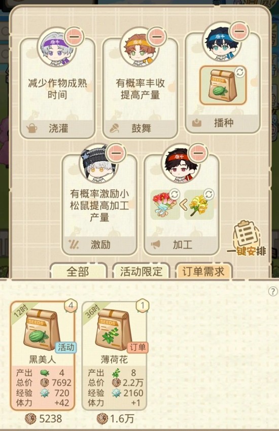 把五个人的任务分配好就不要动了,优先升级他的任务和体力(如我的炸梨酥负责浇灌就只升级浇灌和体力)注意请不要喂饱他们了再升级,因为升级会回复50点体力,不要浪费了;