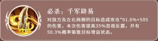 千军辟易是魏延的核心必杀技,释放时可对正前方目标及其左右两侧共三名敌人造成范围伤害。基础伤害由攻击力百分比和固定数值构成,后期还能提升35%的忽视反震效果。该技能附带50%概率驱散目标增益状态,虽然清除数量有限,但在关键时刻可打断敌方关键buff。这一技能使魏延在团战中具备极强的干扰与压制能力,是其作为主力输出的重要保障。