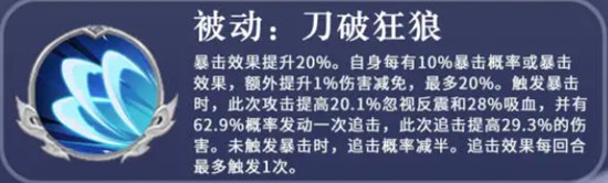 张辽的被动技能刀破狂狼进一步强化了他的暴击体系。激活后直接增加20%暴击率,并根据每10%暴击概率额外获得1%伤害减免,最高叠加至20%减伤。若攻击触发暴击,则提升20%伤害并附加62%概率的追击机会。追击成功时,还能再提高29%伤害,显著增强连贯输出能力。未暴击时追击概率减半,但每个回合仍可尝试一次触发。