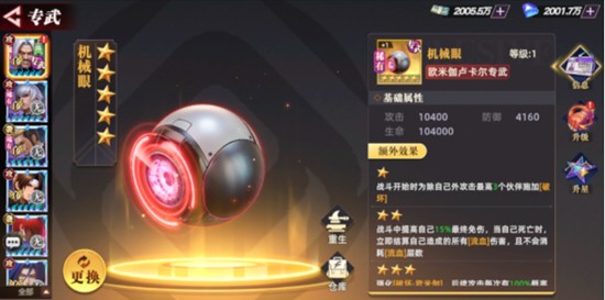 在专属武器方面,欧卢推荐搭配机械眼,该专武每提升一星都能带来显著属性增强,最高可升至五星。机械眼的特效针对处于流血状态的敌人提供伤害加成,与欧卢的技能机制完美契合,大幅提升其持续输出能力。后期阵容搭配推荐大蛇、高尼兹、神乐千鹤和特瑞,其中大蛇与欧卢共同承担群体输出,高尼兹负责单体收割,神乐千鹤提供团队增伤,特瑞则加速全队怒气积累,提升技能释放频率,整体阵容协同性强,适用多种战斗场景。