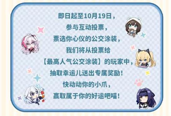 卡拉彼丘手游公测在即,承载着美少女超弦体的“卡拉彼丘喵喵号”即将出发,与各位领航者一起开启一段奇妙的旅程!从即日起至10月19日玩家参与互动投票,票选你心仪的公交涂装。官方将从投票给【最高人气公交涂装】的玩家中,抽取幸运儿送出专属奖励!