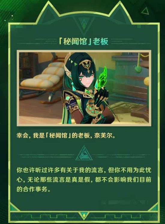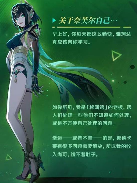 奈芙尔,作为「秘闻馆」的主人,她拥有解读风中秘密的能力,能够听到风带来的各种消息。她的智慧和神秘感使她在游戏中扮演着重要的角色。奈芙尔不仅是一位强大的战斗者,也是一位能够为队伍提供战略支持的角色。