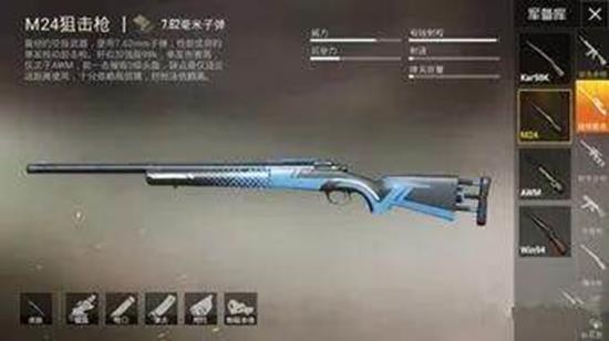使用7.62毫米子弹,标准弹匣容量5发,装备扩容弹匣后可达7发。这把狙击枪对三级头盔同样具有压制力,整体伤害表现优异,各项数据均优于Kar98k。M24主要通过空投获取,偶尔也会在高级物资区刷新。