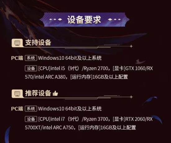 PC端:系统Windows10 64bit及以上系统设备:[CPU]Intel i5(9代)/Ryzen 2700,[显卡]GTX 1060/RX 570/Intel ARC A380,[运行内存]16GB及以上配置