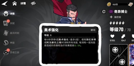 奇异博士的被动技能每10秒叠加一层奥术强化,最多可叠加三层。该效果直接提升其技能释放频率与强度,是维持战场续航的关键。随着层数积累,其维山帝之佑的触发概率与深红束带的控制时间也会间接增强,使得他在长时间战斗中表现愈发稳定。这一机制要求玩家尽量避免让奇异博士过早阵亡或被沉默,以确保能量循环不断。