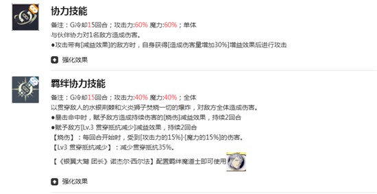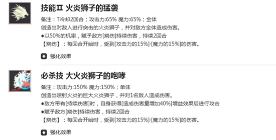 作为群体攻击技能,火炎狮子的猛袭可对敌方全体造成65%魔力与攻击力的复合伤害。此外,该技能有50%概率使目标陷入烧伤状态,使其在后续回合内持续受到伤害。每次释放此技能时,还能通过专属被动额外触发一次烧伤效果,进一步提升覆盖率。这意味着法格莱恩不仅能打出可观的AOE伤害,还能为团队创造稳定的持续伤害环境,为后续技能联动提供支持。