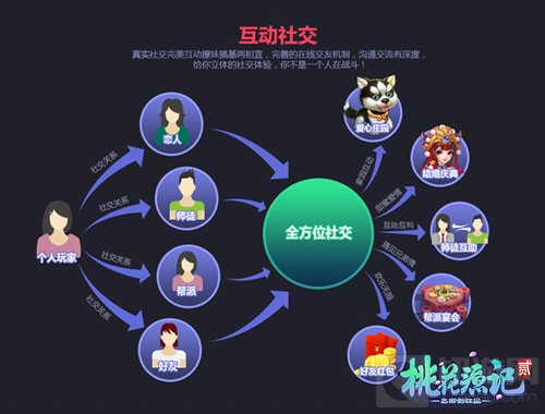 在虚拟的游戏世界里,除了获得娱乐之外,社交是永恒的主题。《桃花源记2》内置强大而丰富的社交朋友圈,趣味多样的帮派活动,独创自建宗门收徒系统,联盟系统、战队系统等等,多样化的社交互动机制,拉近了玩家和玩家之间的真实距离。