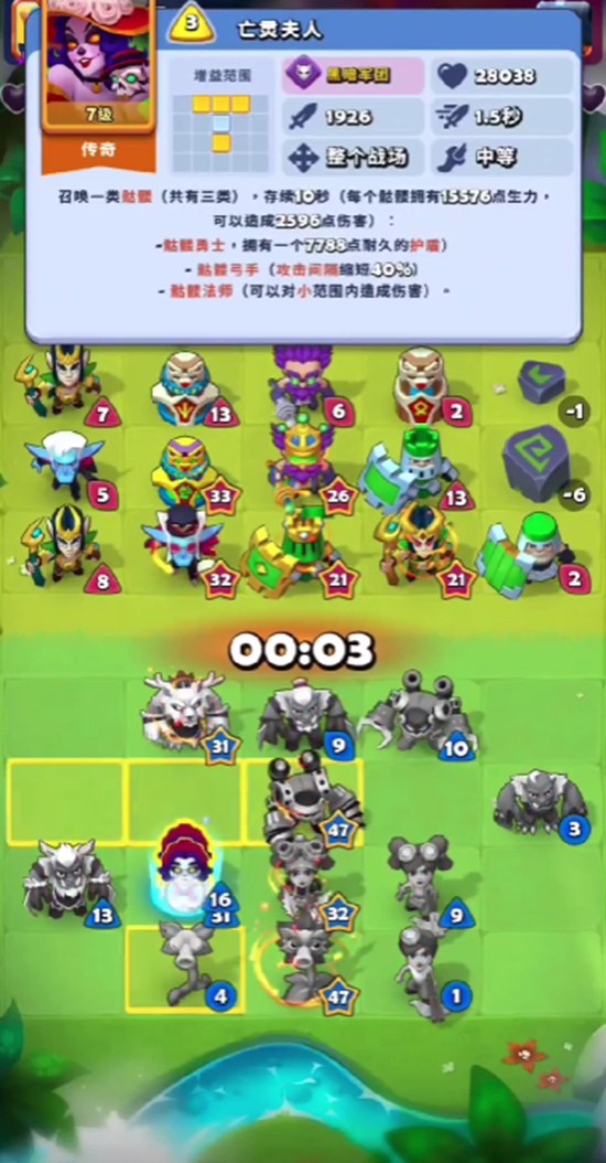 在阵容搭配上,建议围绕黑暗军团体系构建主力阵容。搭配傀儡、巨兽等同阵营单位可激活额外加成效果,进一步放大战斗力。同时,为了维持亡灵夫人及其召唤物的生命状态,推荐编入图腾类回复单位或仙灵这类辅助角色。当队伍中有治疗手段时,只要主目标血量被抬满,所有由亡灵夫人召唤出的单位也会同步恢复,极大提升了团队整体的稳定性与持续作战能力。