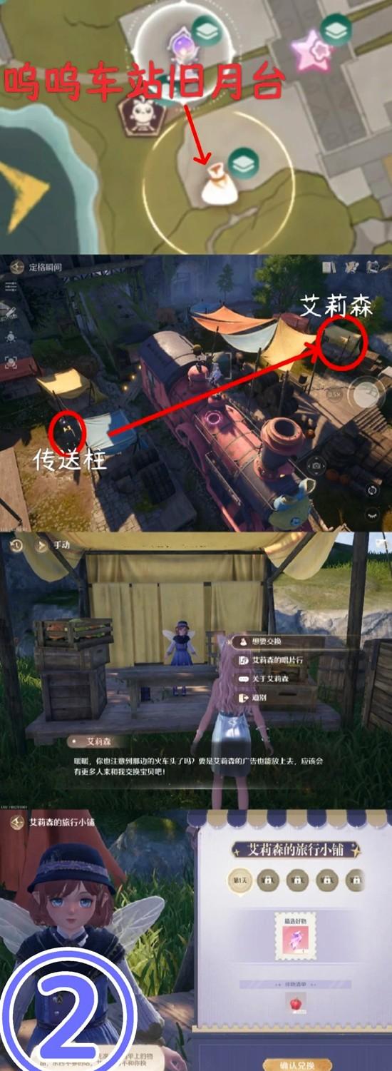②在艾莉森处成功兑换1次,传送到【呜呜车站旧月台】→往旁边有火车的方向走→「艾莉森」在黄色棚下→点击对话,兑换即可。