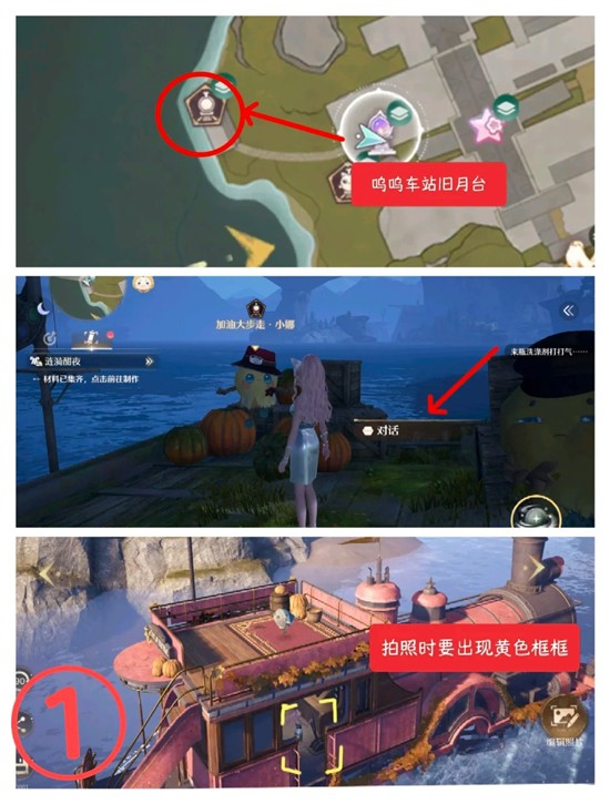 第一张:传送到呜呜车站旧月台,找到【加油大步走·小娜】对话完,驾驶车辆期间拍照即可。