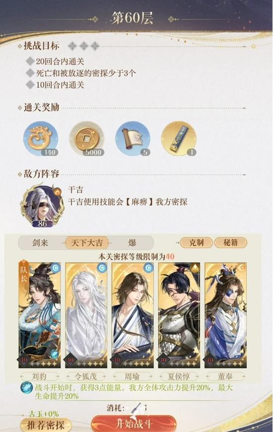 如鸢游戏以策略卡牌和沉浸式剧情为核心玩法,玩家只需完成指定任务和剧情对话就能快速通关。每一位男主按顺序会开启地宫玩法,本次地宫是左慈璃魂月魄地宫,那么地宫55和地宫60应该怎么打呢?小编为你准备了一份攻略,一起来看看吧~