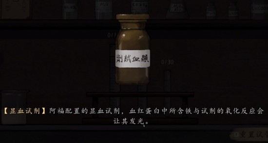 获取试剂后,玩家需将其组合调配,制成能够显现隐形血迹的特殊药剂。随后可在神龛所在房间内使用该试剂进行涂抹检测。房间多处位置隐藏着重要线索,例如神龛上的佛像,其表面纹路与死者伤痕相似,但并非真正凶器;柜台上的铁锭也需检查,同样排除嫌疑。真正的血迹出现在右侧区域,通过试剂可显现出两张图表上的残留痕迹以及地面遗留的血渍,点击这些位置即可完成线索收集。
