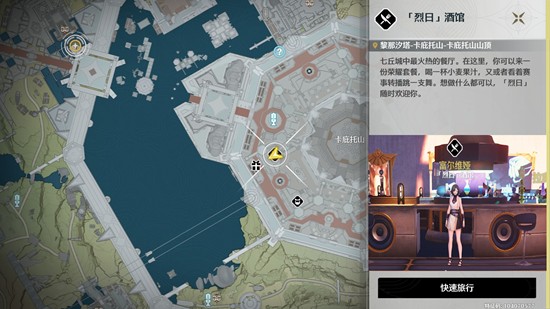 烈日酒馆位于黎那汐塔的卡庇托山山顶,由NPC富尔维娅经营。与其对话并选择“我想买点吃的”选项后,可直接购买多种菜肴及对应食谱。其中包括栎木蜜饼食谱、沙丁布卡食谱、特浓奶昔刨冰食谱、扁竹花花片食谱等。此外,盐海爆爆康食谱、酿渍橄榄食谱、分瓣面包食谱以及云凝月桂虾食谱也均可在此处购得,是鸣潮中食谱数量最多的获取点之一。