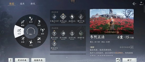 狮吼功,凌云踏,解控必带,其他的看自己打法习惯,无相,骑马和迷踪步也可考虑选带