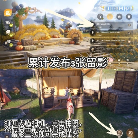 打开大喵相机,点击拍照,然后点击箭头所指的留影,留影三次即可完成任务