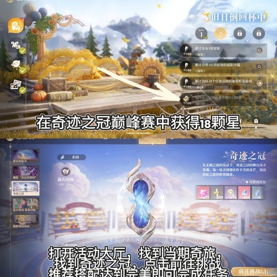 打开活动大厅,找到当期奇旅,找到奇迹之冠,点击前往挑战,进去后使用推荐搭配评分达到完美即可完成任务
