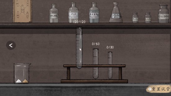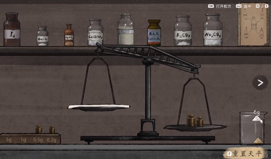 玩家需要找到并打开场景中的试剂台,界面左侧为药品放置区,配有不同重量的砝码,右侧则用于放置最小单位的砝码。根据游戏提示,玩家需按照指定顺序将固体药品依次放入左侧托盘,并严格按照提示的配比操作。所有固体添加完毕后,进入液体调配阶段,使用试管按要求加入对应液体试剂,最终完成调配。整个过程模拟了真实实验中的称量与混合步骤,增强了山河旅探作为侦探游戏的专业性。
