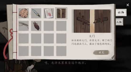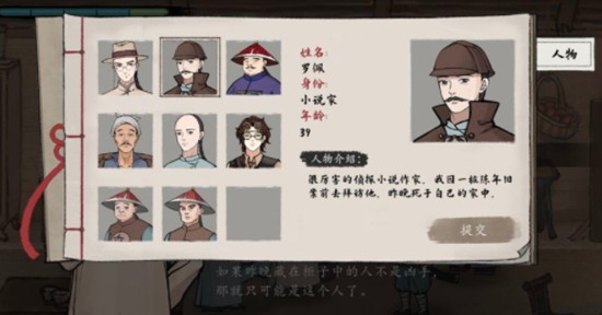 在山河旅探的第一章中,案件发生在一艘航行于海上的船只上,死者为一名船员。经过调查与尸检,最终确认凶手是罗世文。此人因看到死者身上携带财物,心生贪念,遂将其杀害并伪装成自杀现场。玩家可通过检查尸体上的伤口、收集现场的木茬以及比对遗书与手稿的笔迹等关键证据,逐步锁定罗世文的罪行。这一章作为入门案件,为玩家熟悉山河旅探的探案流程打下基础。