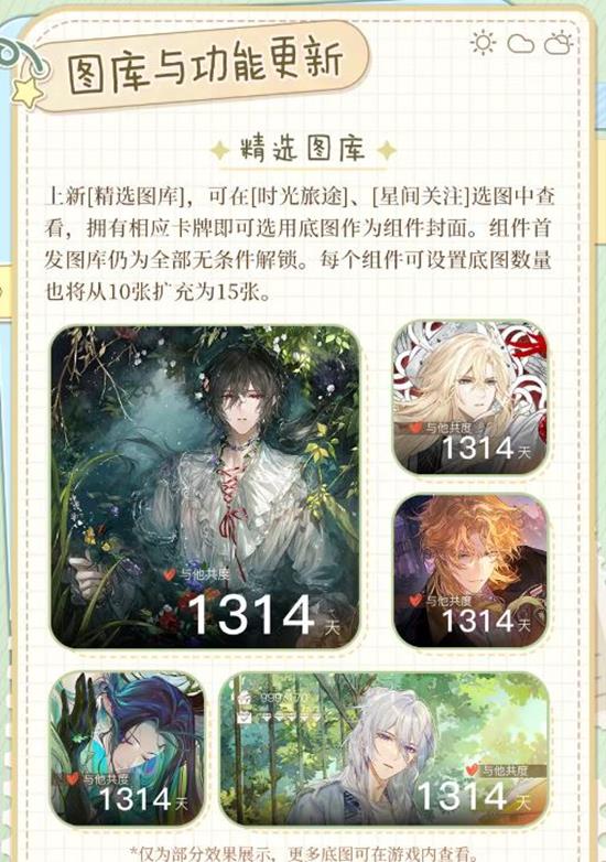 精选图库:上新[精选图库],可在[时光旅途]、[星间关注]选图中查看,拥有相应卡牌即可选用底图作为组件封面。组件首发图库仍为全部无条件解锁。每个组件可设置底图数量也将从10张扩充为15张。