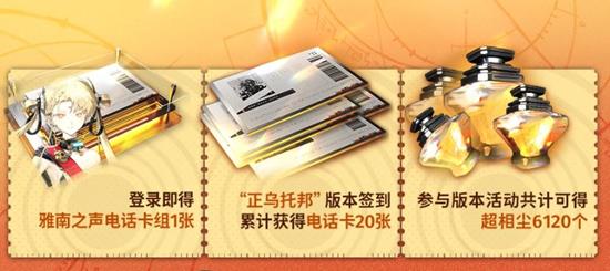 登录游戏即可获得“雅南之声”电话卡组1张。此外,“正乌托邦”版本签到累计可获得电话卡20张。参与版本活动共计可获得超相尘6120个。