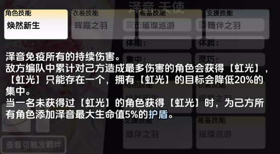 泽音的核心技能为焕然新生,释放后可使自身免疫所有持续伤害效果,并锁定敌方编队中对己方造成伤害最高的目标施加【虹光】状态。该状态不可叠加,仅能存在于一名敌人身上,受影响目标的集中值会降低20%。当一名敌人首次被标记【虹光】时,泽音将为全队角色附加相当于其最大生命值5%的护盾,有效提升团队抗打击能力。