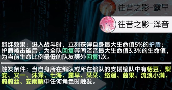 泽音的支援技能随伴之羽可在战斗中多次触发,当己方首次有角色生命值降至95%、60%以下,或30%、5%以下时,会立即为其回复其最大生命值5%的血量。这一机制虽不频繁,但在关键时刻可打断低血线危机,为治疗技能争取释放时间,增强队伍容错率。