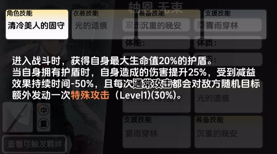 柚恩的核心技能之一是清冷美人的固守,该技能在战斗开始时为她提供相当于最大生命值20%的护盾。只要护盾存在,她造成的伤害提升25%,同时受到的减益效果持续时间减少50%。此外,在技能生效期间,每一次普通攻击都会额外触发一次对随机敌人的特殊攻击,形成稳定的附加输出链。这一机制使得柚恩在保持护盾不断的情况下,既能站得住,又能打出可观的物理伤害,是她作为高生存副C的关键支撑。
