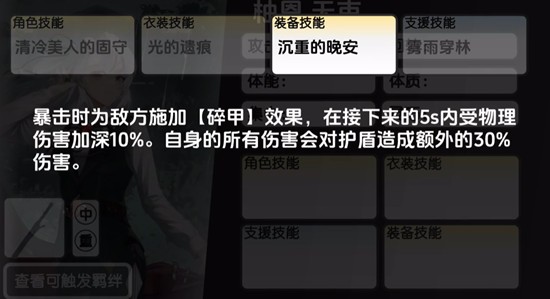 在装备技能的选择上,沉重的晚安为柚恩提供了重要的输出增益。当她成功暴击时,可为敌人施加【碎甲】状态,使其在接下来5秒内受到的物理伤害提升10%。同时,柚恩自身的所有伤害对敌方护盾造成额外30%的破坏效果。这项能力不仅增强了她对护盾型敌人的压制力,也提升了整体物理队的破防效率,尤其在面对高防御或护盾保护的敌人时表现突出,进一步巩固了她在物理输出体系中的地位。