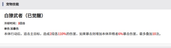 当追击攻击成功触发暴击时,白獠武者会为角色叠加一层暴击伤害增益,每层提升5%至6%的暴击伤害,最多可叠加十层。这意味着在理想情况下,角色最终可获得50%到60%的额外暴击伤害加成。该效果在战斗初期提升较为缓慢,但随着战斗进行,叠加层数逐渐累积,输出能力呈指数级增长。这种越战越强的特性让白獠武者在持久战或高难度副本中展现出明显优势。
