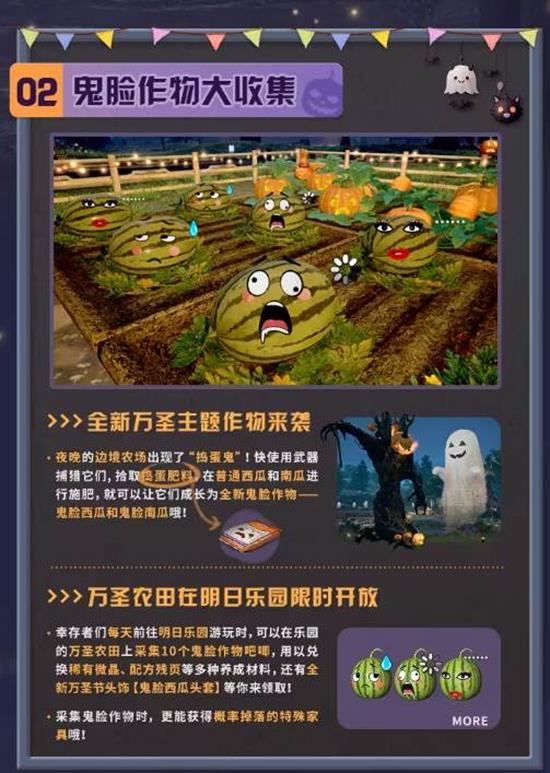 幸存者们每天前往明日乐园游玩时,可以在乐园的万圣农田上采集10个鬼脸作物吧唧,用以兑换稀有微晶、配方残页等多种养成材料,还有全新万圣节头饰【鬼脸西瓜头套】等你来领取!采集鬼脸作物时,更能获得概率掉落的特殊家具哦!