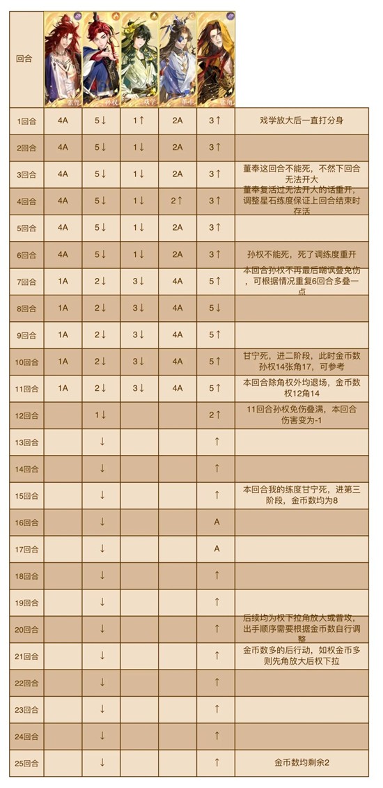 注意点:董奉3回合不能死,否则4回合无法开大保命,之后随意;孙权自始至终不能死,否则会跟随张鲁退场。死了直接重开调整练度。
