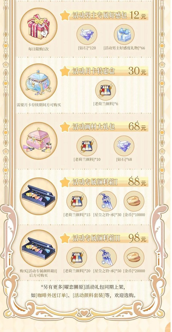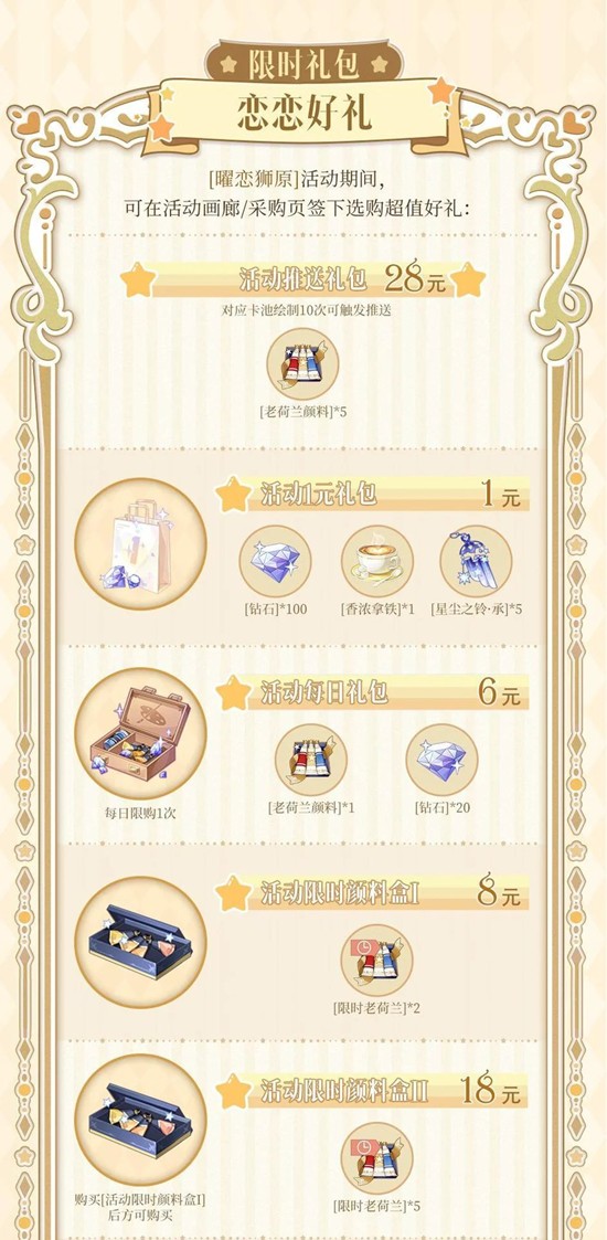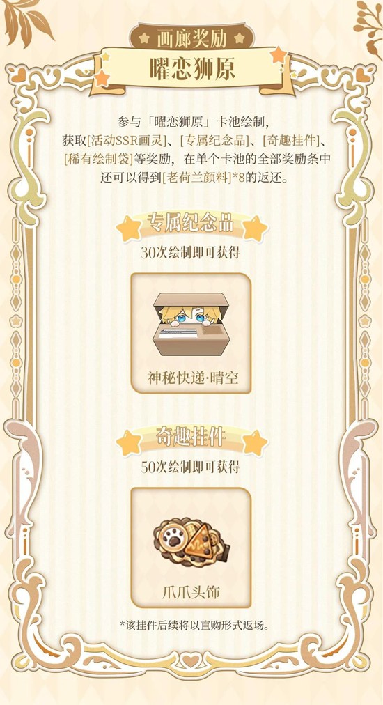 ► 参与「曜恋狮原」卡池绘制,获取[活动SSR画灵]、[神秘快递]、[奇趣挂件]、[稀有绘制袋]等奖励,在单个卡池的全部奖励条中还可得到[老荷兰颜料]*8的返还。