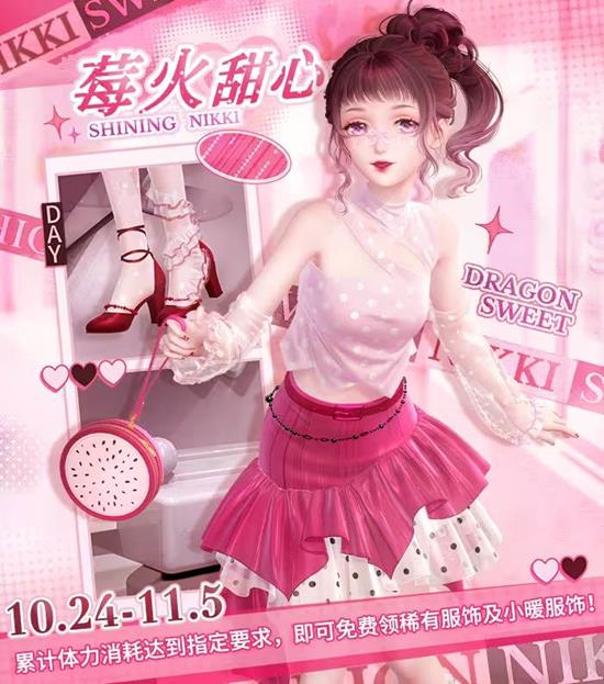 活动介绍:在活动期间,只需达到指定的体力消耗要求,即可免费获得稀有服饰【莓火甜心】以及2件小暖服饰单品。这是一次不容错过的机会,让你的暖暖更加闪耀!