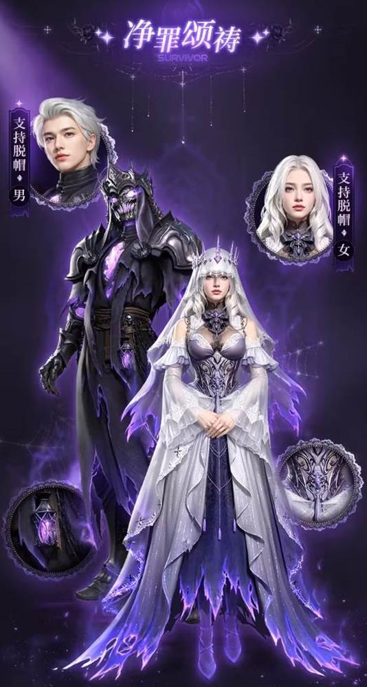由『生还者』厂牌精心打造,以华丽绸缎为画布,全新时装【净罪颂祷】采用重工刺绣,串联宝石与幽火,蚀刻出夜幕的沉静与优雅。荆棘为冠,圣袍燃焰,展现出一种神秘而高贵的气质。