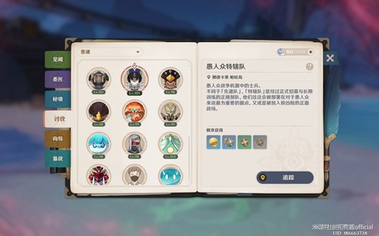 愚人众特辖队成员分布在多个区域,可通过冒险之证中的讨伐任务进行追踪。进入菜单后选择冒险之证,点击“讨伐”分类下的“普通”标签,即可查看当前可挑战的目标位置。击败对应敌人后有几率掉落角色突破素材,建议结合日常清怪一并完成。