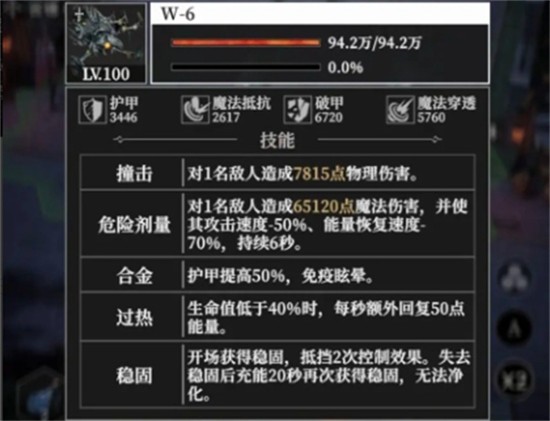 开局阶段需要迅速处理W-6蝎子的增益状态。进入战斗后立即使用夜生白露技能,该技能可清除boss身上护甲以及+50%的增伤buff。这一操作至关重要,能有效遏制蝎子前期的爆发输出,为后续战斗创造安全环境。在地下城堡4骑士与破碎编年史中,控制敌方增益是许多高难战斗的核心环节。