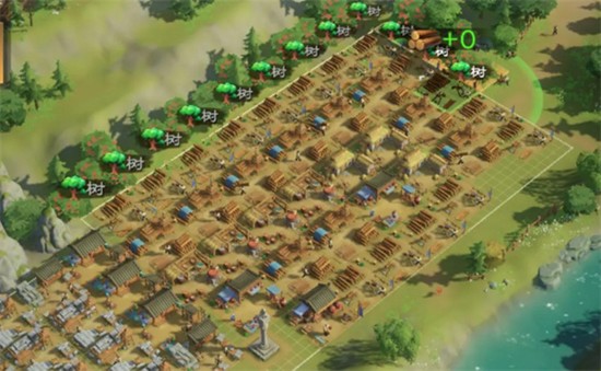 鸿池苑左侧集中了大量石头资源,适宜建造凿石所来高效采集石材。右侧及上方区域则遍布树木资源,适合设立伐木场进行木材收集。利用这些自然资源优势,在对应地块上优先部署一级资源建筑,随后逐步向内圈布局中高级建筑,实现资源的最大化利用。