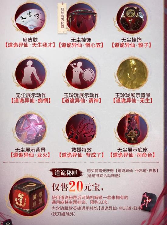道诡异仙秘匣:仅售20元宝,使用后可随机解锁一款未拥有的通用麻将主题挂饰,限购33次。内含隐藏款英雄通用挂饰【道诡异仙·坐忘道·红中】(妖刀姬除外)。