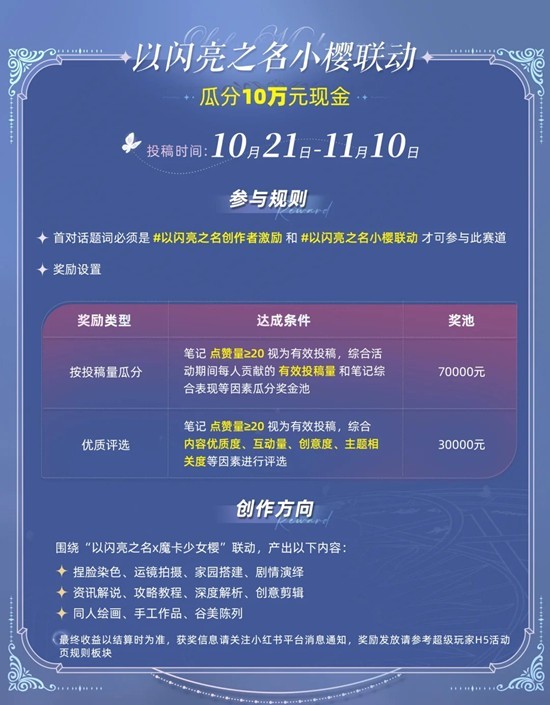 即日起带话题#以闪亮之名创作者激励 和 #以闪亮之名小樱联动 ,分享与《以闪亮之名》游戏最新版本相关精彩创作,即有机会瓜分10万现金奖励。
